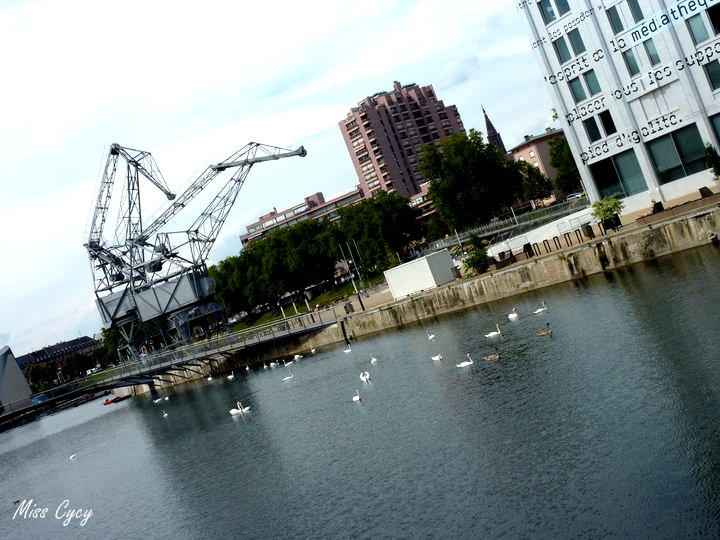 Ce coin vaut le détour pour l’harmonie : les deux grues dans un bassin d’eau, la médiathèque imposante Malraux… font de cette image quelque chose d’assez inattendue.