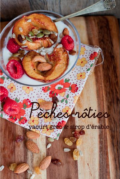 Dans son yaourt, ce sont les pêches qu’Emilie met à l’honneur : rôties au four et accompagnées de diverses graines (tournesol, pistaches, noix amendes). On en a l’eau à la bouche !