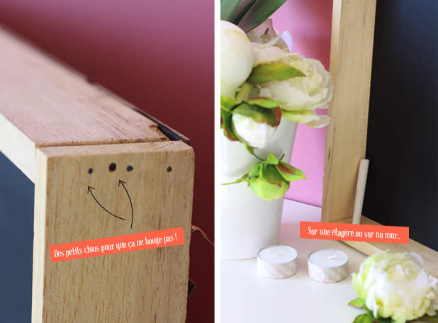 Commencez par passer deux couches de peinture sur votre panneau d’aggloméré (attendre 4 heures entre les deux couches). Puis découpez le tasseau en 4 morceaux (2 de 30 cm et 2 de 60 cm). Ensuite, poncez légèrement les extrémités puis clouez les tasseaux entre eux avec des pointes. Clouez le panneau d’aggloméré au dos des tasseaux. Et enfin, placez les crochets au dos. Il ne vous reste plus qu’à suspendre votre œuvre !