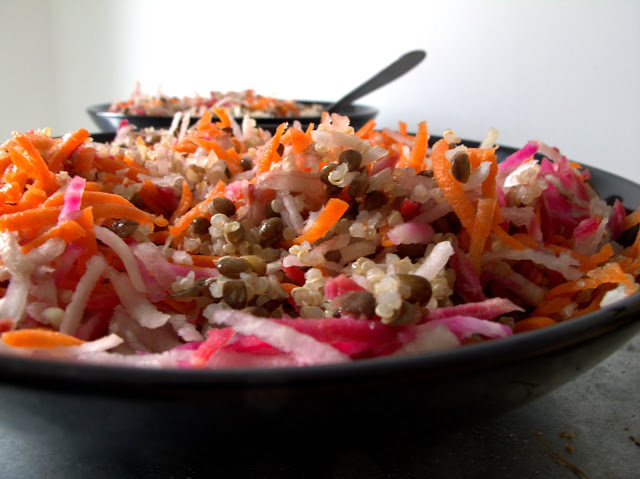 C’est une bien jolie salade que nous propose la blogueuse, un savant mélange cru/cuit et des couleurs qui sentent bon l’été. Au menu : de la betterave, des carottes, du quinoa et des lentilles.