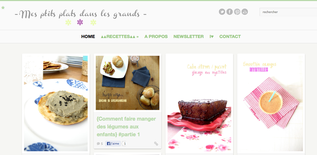 J’aime aussi le blog d’Elen Saveurs Végetales, celui de Mély Chaudron Pastel et celui de Laurence Petits repas entre amis, tous les trois regorgent de superbes recettes et de beaucoup de douceur.
