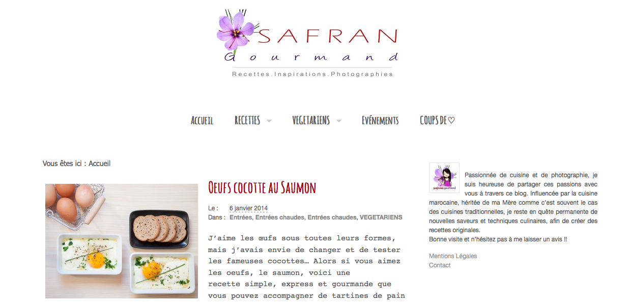 Donc tous ces plats qui ont bercé mon enfance ont créé forcément chez moi une addiction pour les épices… d’où le nom de mon blog « Safran Gourmand ». Ce nom rappelle également mes origines, car le safran est l’épice phare au Maroc, il est utilisé dans les recettes les plus raffinées.