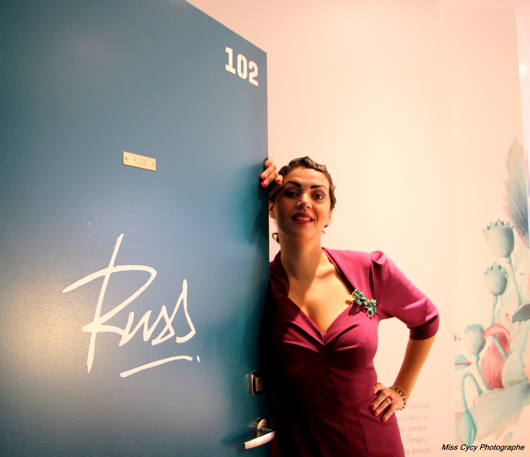 Le rendez-vous est pris à l’hôtel Graffalgar, quartier gare de Strasbourg. Cet hôtel a une particularité : chaque chambre et les pièces communes ont été taguées par un artiste. L’ambiance y est unique, on ressent l’inspiration de l’artiste et son style dans chaque pièce. Notre chambre est la 102, la Russ. Sur fond blanc, on découvre un décor de fleurs, rose, vert … Une douceur s’en dégage.